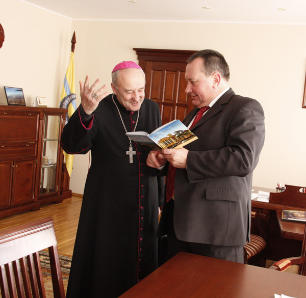 В Рогачеве состоялась встреча высокого гостя с председателем районного исполнительного комитета Виктором Банчуком. Епископ преподнес в дар руководителю района икону, журналы, брошюры, а Виктор Леонидович, в свою очередь, подарил гостю фотоальбом «Мой любимый Рогачев». В ходе беседы, в которой приняли участие также настоятель римско-католического прихода святого Антония Падуанского в Рогачеве ксендз Андрей, заместитель председателя райисполкома Василий Корольчук и другие лица, было высказано взаимопонимание по вопросам сотрудничества на благо населения Рогачевщины. Поднимался и вопрос завершения реставрации костела святого Антония Падуанского.