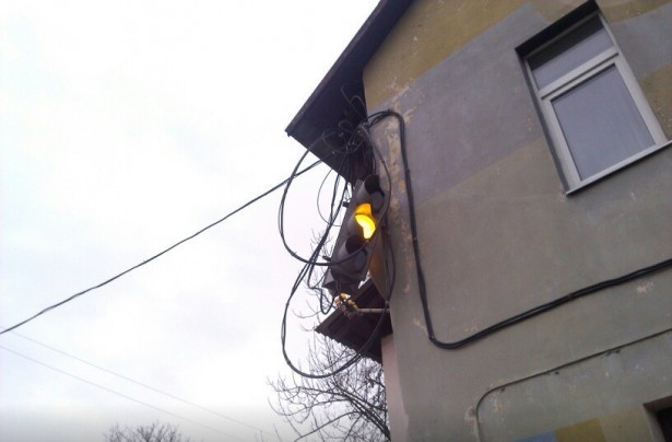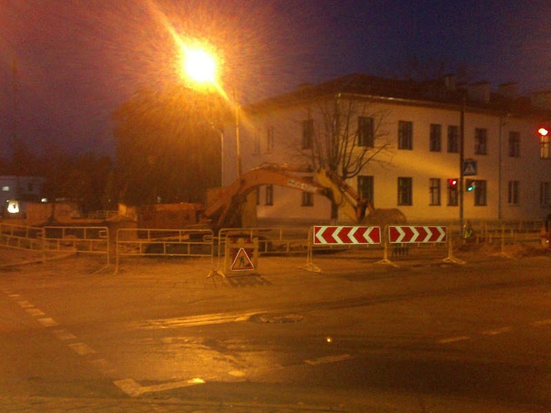 Из-за ремонтных работ на перекрестке Мирошниченко работники КЖУП «Светочь» решили убрать мешающий экскаваторам висящий светофор. При этом решили повесить его на дом и закрепить на углу над электрическим щитом.