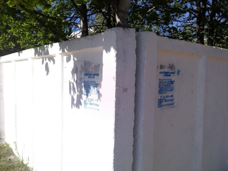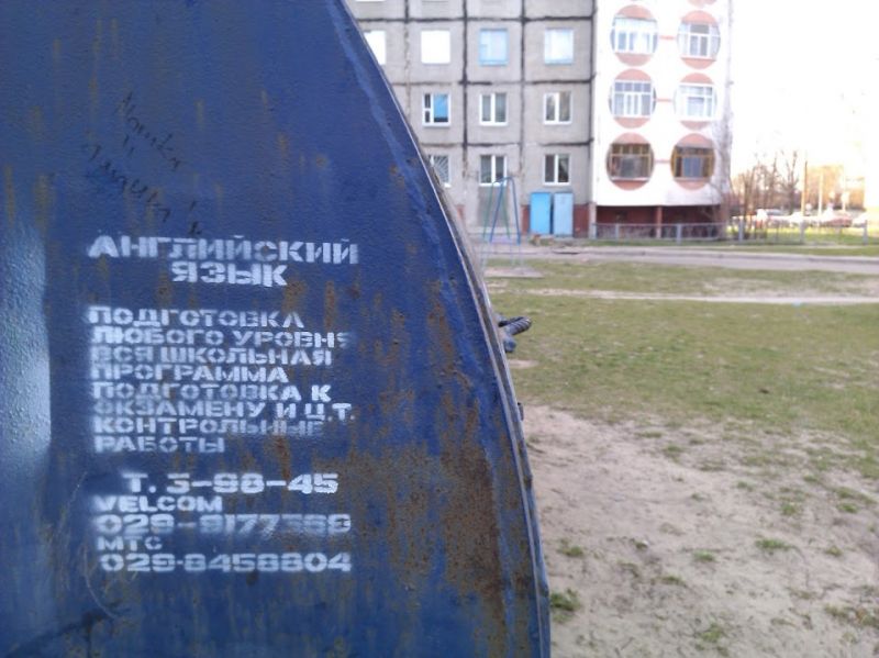 В Светлогорске уже продолжительный период времени на остановках и других местах появляются объявления об обучении английскому языку. Всё бы ничего, но объявления нанесены краской через трафарет и так просто от них не избавишься. Вот и получается, что преподаватель иностранного языка занимается порчей городского имущества, его объявления нанесённые данным методом расположены во всех частях города.