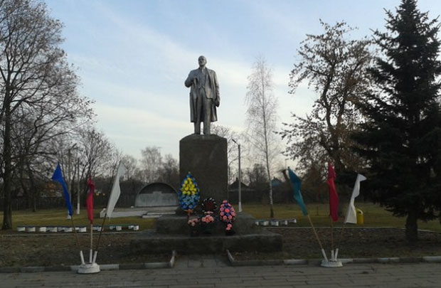 Фотофакт: в Паричах к памятнику Ленина возложили венок цветов украинского флага