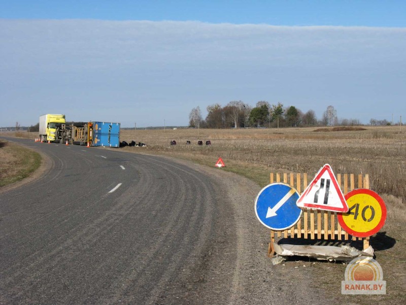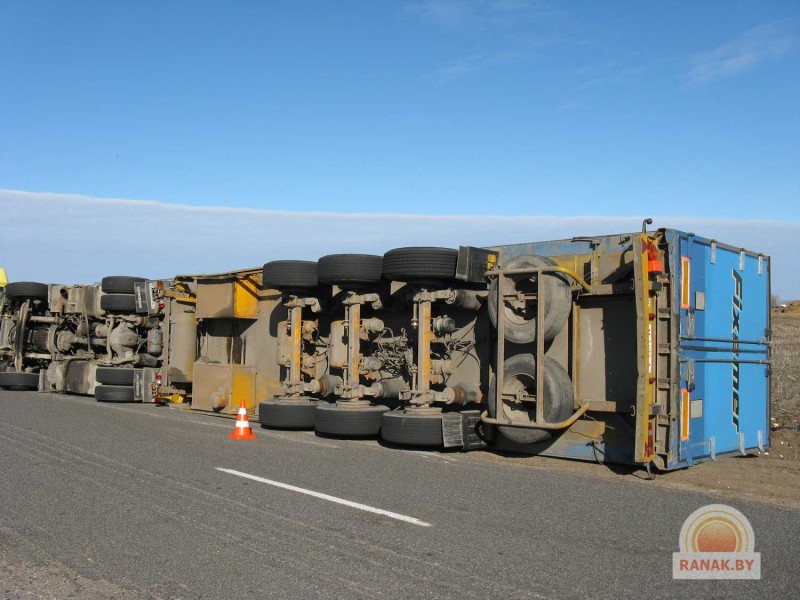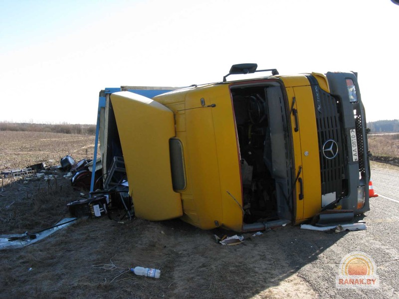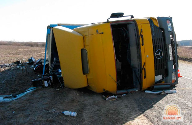 Как сообщают сотрудники Госавтоинспекции, большегрузный автомобиль «Мерседес» с прицепом ехал из Жлобина, с БМЗ, с грузом металлических катушек. «Мерседес», принадлежащий одной из минских транспортных фирм, должен был доставить груз в Украину. Водитель не учел дорожные условия, а также состояние перевозимого груза. В результате при маневре не справился с управлением, фура перевернулась.