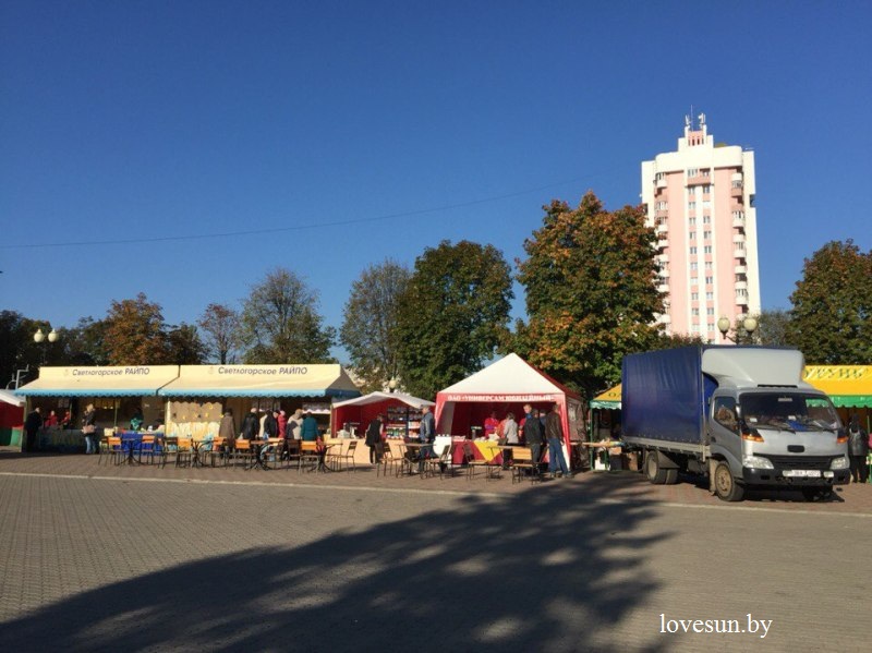 В воскресенье на Центральной площади Светлогорска прошла ежегодная осенняя ярмарка. На ней все желающие могли приобрести овощи, саженцы деревьев, мёд, свежую выпечку и многое другое. Данное мероприятие уже давно стало традиционным, горожане ждут его чтобы запастись на целый год картошкой, луком и другими овощами. Для посетителей были подготовлены столики, где все желающие могли присесть отдохнуть или перекусить.