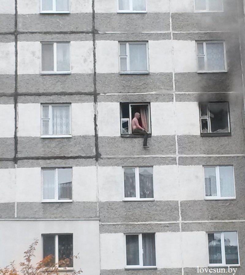 Обновлено: из окон пошел небольшой дым, спасатели МЧС быстро среагировали, но мужчина кидает в них плафоны от люстры и другие предметы своего интерьера.