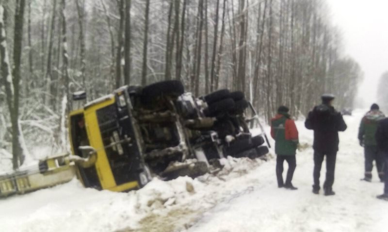 Фотофакт: из-за снега в Светлогорском районе перевернулись МАЗ и легковушка