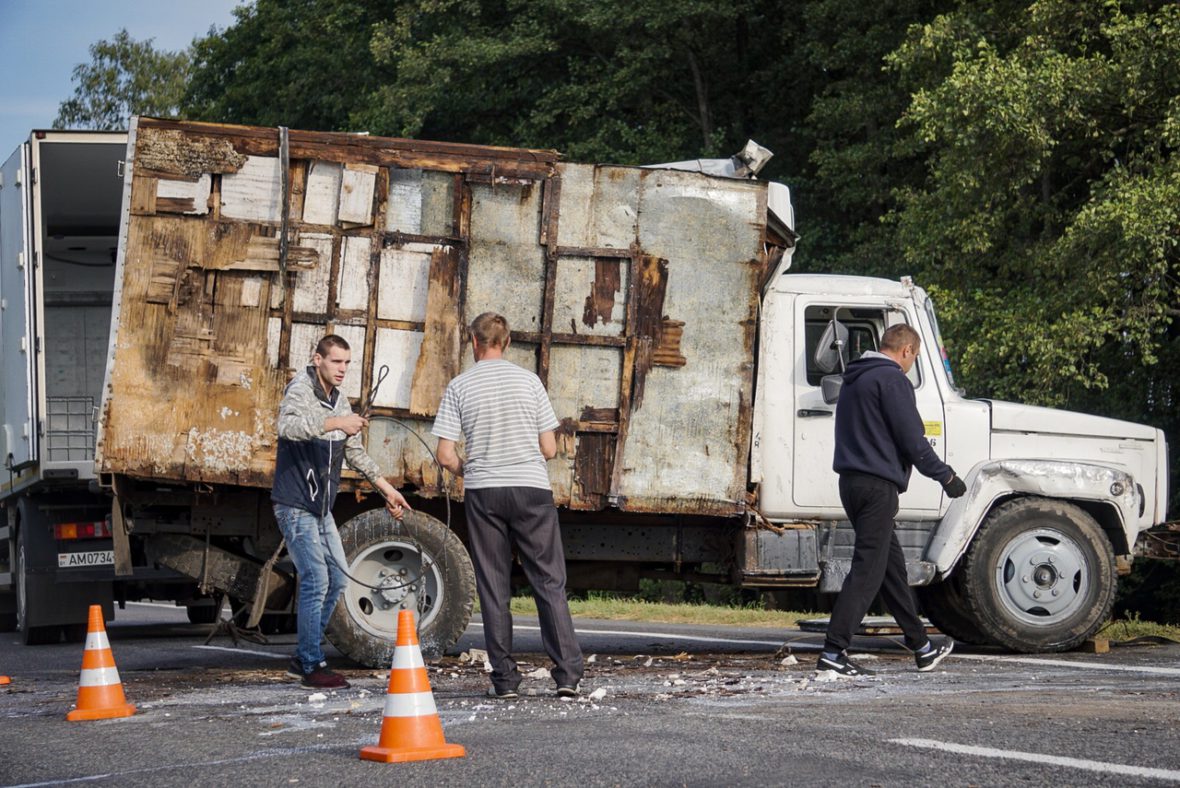 Утром груженый молоковоз выехал с территории молочного завода в сторону города. Около 8.15, не доезжая примерно 50 метров до того самого поворота, водитель, по его утверждению, не справился с управлением. Грузовик буквально лег на дорогу и перегородил ее. Молоко разлилось по трассе. Молоковоз подняли при помощи трактора. Водитель не пострадал и пытался спасти остатки продукции. Источник: ranak.me