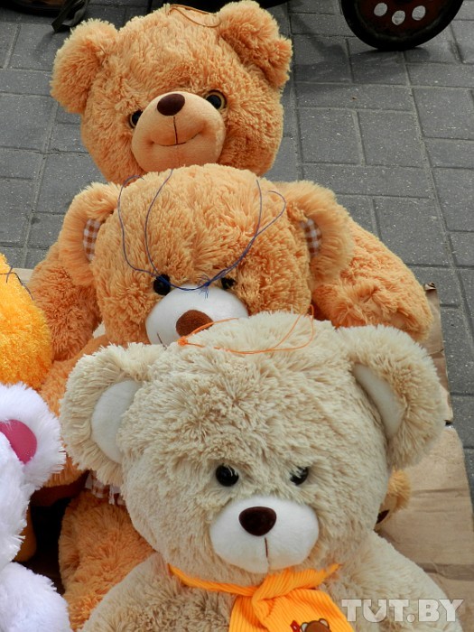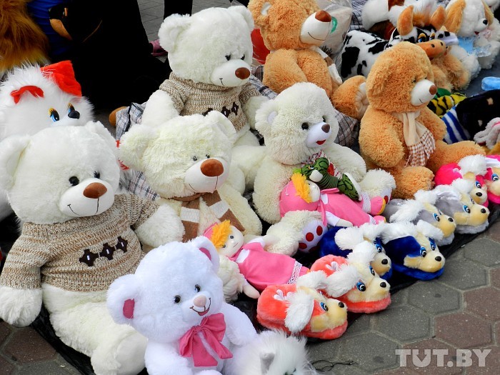 Действительно, плюшевые медведи всех цветов и размеров составляют на мини-рынке за вокзалом в Жлобине порядка 80% всего ассортимента. Есть и бежевые, и коричневые, и желтые, и белые; в свитерах и шарфах... Покупают их действительно охотнее, чем прочих зверушек, что после шведской пиар-акции отнюдь не удивительно.