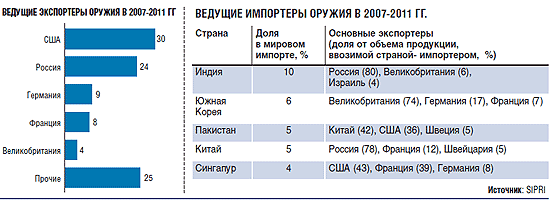Лидером по оборонным закупкам с 2007 по 2011 год стала Индия (10% от мирового импорта), сместив с первого места на четвертое Китай. Главным поставщиком для Индии по-прежнему остается Россия, у которой приобретались в основном самолеты, в том числе 120 истребителей Су-30МК и 16 корабельных истребителей МиГ-29К.