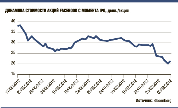 Котировки Facebook падали почти всю прошлую неделю и в четверг обвалились ниже отметки в 20 долл. По итогам пятницы бумаги лишь незначительно подросли, до 21,09 долл. В целом с момента размещения акции Facebook подешевели на 45%, что привело к выходу основателя компании Марка Цукерберга из списка десяти богатейших предпринимателей технологического сектора.