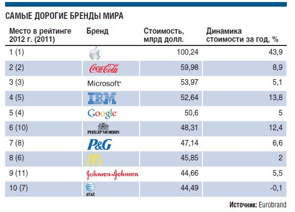 Сообщество независимых экспертов в области оценки брендов, патентов и высоких технологий Eurobrand в среду представило миру список самых дорогих брендов планеты. Как и ожидалось, верхнюю строчку вновь заняла Apple, интерес к продукции которой растет как на дрожжах.