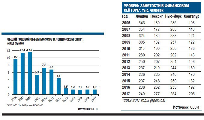 Несмотря на желание правительства Дэвида Кэмерона защитить репутацию Лондона как ведущего финансового центра, город может потерять этот статус уже в текущем году. По оценке Центра исследований экономики и бизнеса (CEBR), в 2012 году лондонский Сити уступит пальму первенства Нью-Йорку, а в 2015 году и вовсе скатится на третье место, пропустив вперед Гонконг. Из-за низкой деловой активности в Сити стремительно сокращаются рабочие места, а заодно и бонусы.