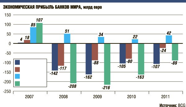 Так, экономическая прибыль банков (прибыль после вычета всех затрат, включая альтернативные издержки) остается отрицательной уже четвертый год подряд. В 2011 году этот показатель был равен 89 млрд евро (подробнее см. график). Главная причина этого — риски обходятся банкам на 75% дороже, чем до кризиса. И в обозримом будущем давление на прибыль сохранится.