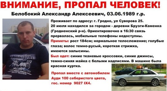 20 июля 2013 года пропал Белобокий Александр. Последний раз его видели в д. Брузги-Каменка. Около 16.30 связь с ним прервалась, а телефоны оказались недоступны.