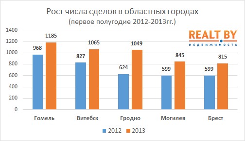 По данным Национального кадастрового агентства за 6 месяцев текущего года больше всего сделок с квартирами было совершено в Гомеле – 1185. В Витебске за отчетный период совершено 1065 сделок, в Гродно – 1049, в Могилеве – 845 и в Бресте – 815 сделок (данные на 11 июля 2013 года). Для сравнения: в первом полугодии прошлого года в Гомеле совершено 968 сделок, в Витебске – 827, в Гродно – 624, в Могилеве и Бресте – по 599 сделок. Таким образом, в первом полугодии 2013 года больше всего покупательская активность по сравнению с аналогичным периодом прошлого года возросла в Гродно – на 68%.