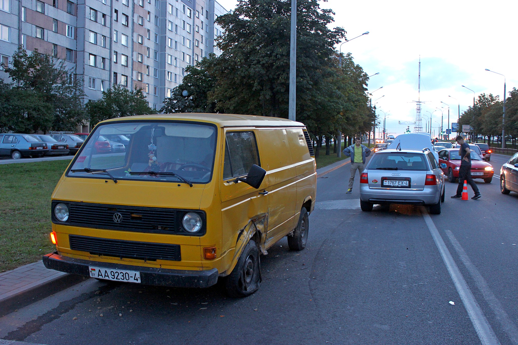 От удара Audi бросило влево, в сторону пешеходного перехода, где стояли люди. Водитель сумел выкрутить руль, но задел встречный микроавтобус Volkswagen T2.