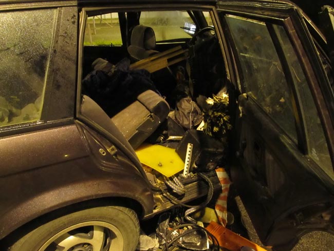 На мокром асфальте улицы Магистральной 25-летний водитель «БМВ», приближаясь к съезду на Озерское шоссе, ошибся с выбором скорости. Смещаясь в левый ряд, его авто врезался в остановившийся на полосе «Ситроен», который продвинулся вперед и ударил «Фольксваген». На заднем сидении «БМВ» ехал 5-летний племянник водителя. Его ударило выскочившей из багажного отсека надмогильной плитой, которую предстояло установить на могилу деда. Пролетев через салон, она упала рядом с приборной панелью.
