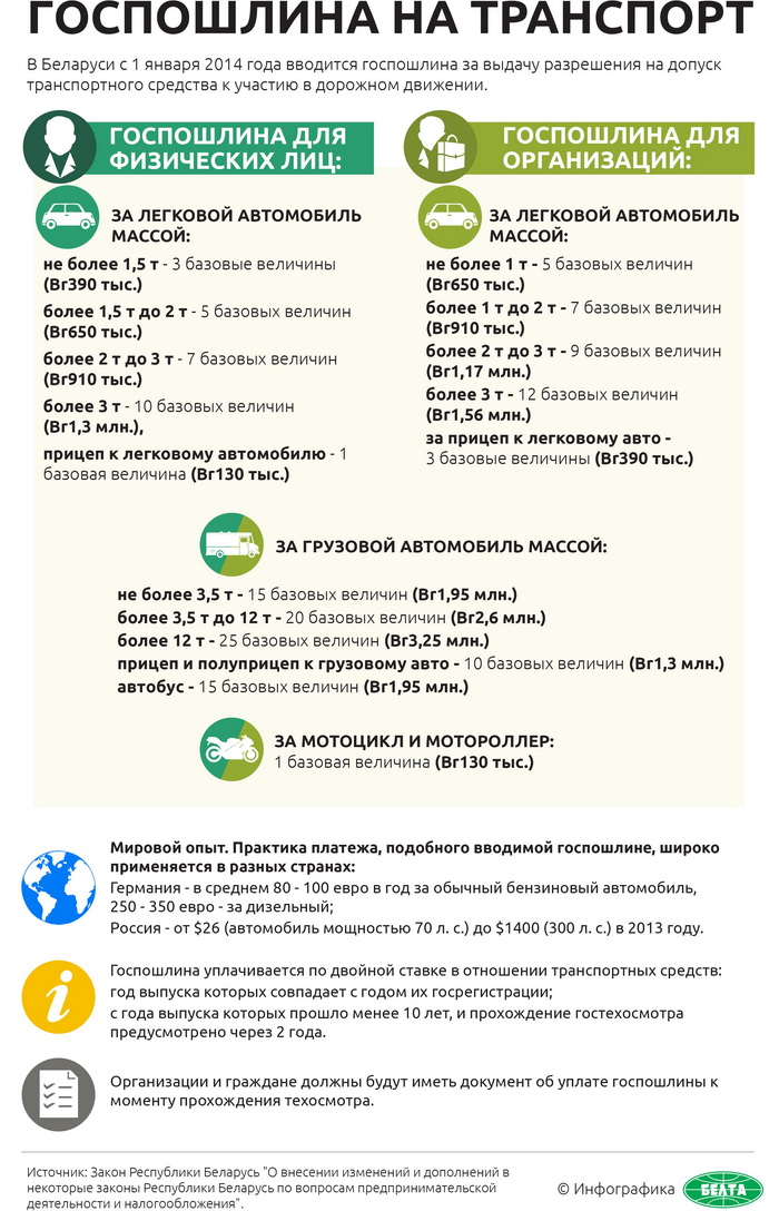 «Привязана» госпошлина будет к массе автомобиля. Владельцам машин весом до 1 тонны в год придется выложить 3 базовые величины (390 тысяч рублей). Впрочем, большинство легковушек, бегающих по Беларуси, весят от 1 до 2 тонн. В этом случае пошлина составит 5 базовых величин, или 650 тысяч рублей на сегодняшний момент.