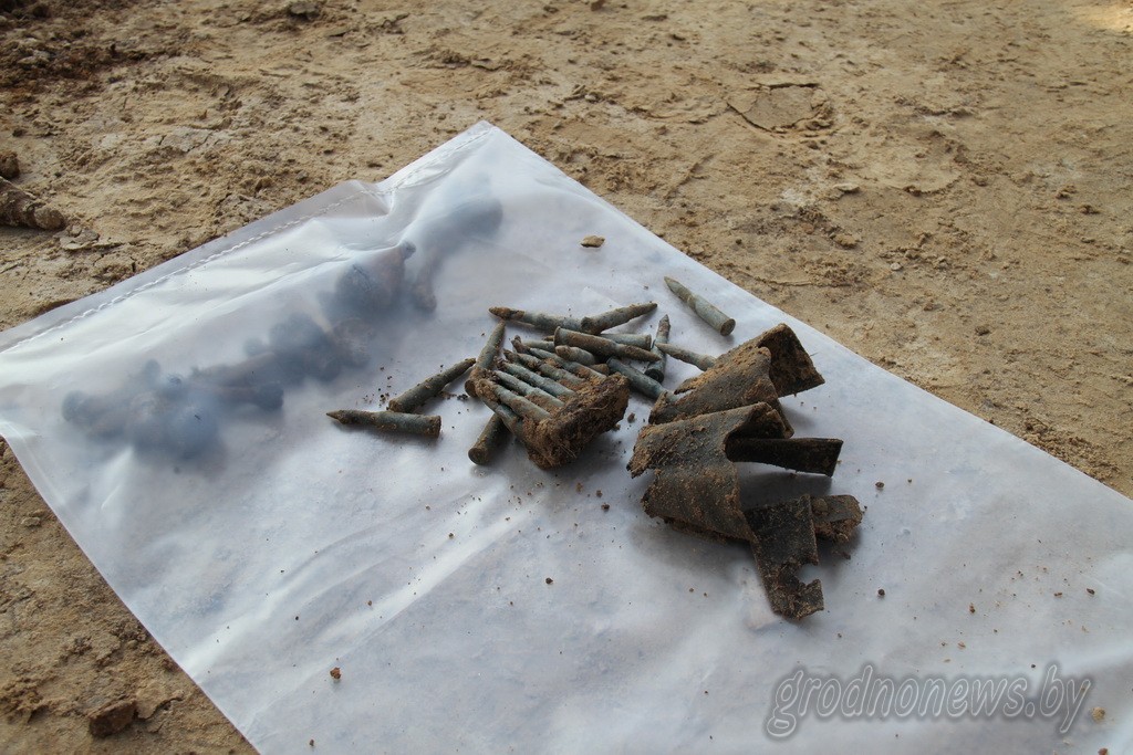 – В этом месте, скорее всего, был оборудован дзот, о чем говорят остатки бревен на месте находок. Возвышенность была удобной для ведения огня, поэтому неудивительно, что здесь разместилась пулеметная точка. Такие находки, как граната, остатки снайперской винтовки, патроны к винтовке и пулемету, патронный ящик из-под пулеметных лент для «максима», говорят, что сражались здесь, вероятнее всего, трое бойцов: расчет пулемета и снайпер. Один из них погиб, обнаружены его костные останки, – рассказал Александр Кавун, ведущий специалист отдела идеологической работы и социальной защиты областного военного комиссариата. – Воевали на этом направлении бойцы 85-й стрелковой дивизии, стоявшей в окрестностях Гродно. К сожалению, почти весь ее личный состав в первые дни войны погиб...
