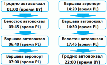В 01:00 с автовозала г. Гродно. Прибытие в Белосток 03:45(время PL). Прибытие в Варшаву а/в Западный в 06:40(время PL), в Варшаву аэропорт им. Шопена в 07:00(время PL).