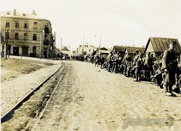 Скидельская улица в годы Первой мировой войны. Справа рынок. Фото Феликса Ворошильского.