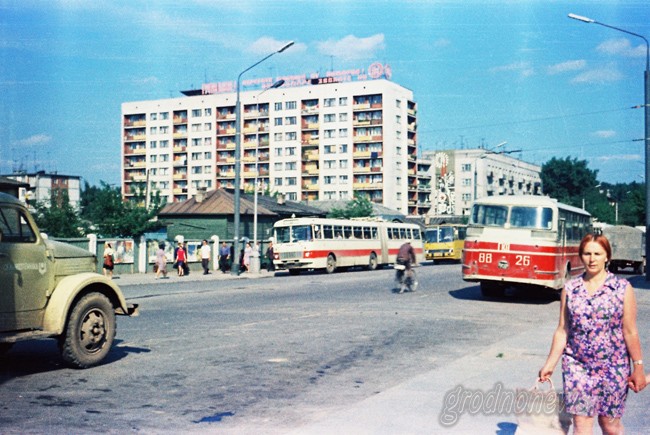 Когда-то в доме, где сейчас расположены помещения пригородного автовокзала, находился мясомолочный павильон. Вдоль улицы Скидельской за высоким дощатым забором, отделявшим территорию рынка от проезжей части улицы, тянулись вереницей маленькие магазинчики потребкооперации, в которых можно было купить как продукты питания, так и промтовары. Через всю территорию рынка шли торговые ряды, на которых продавалась сельскохозяйственная продукция, выращенная на колхозных полях и фермах, а также на частных подворьях. Один вход на территорию рынка был со стороны улицы Красноармейской, второй – с улицы Захарова. На углу улицы Захарова и проспекта Космонавтов во второй половине 60-х годов вырос один из первых в городе 9-этажных жилых домов. Напротив дома был вход на рынок.