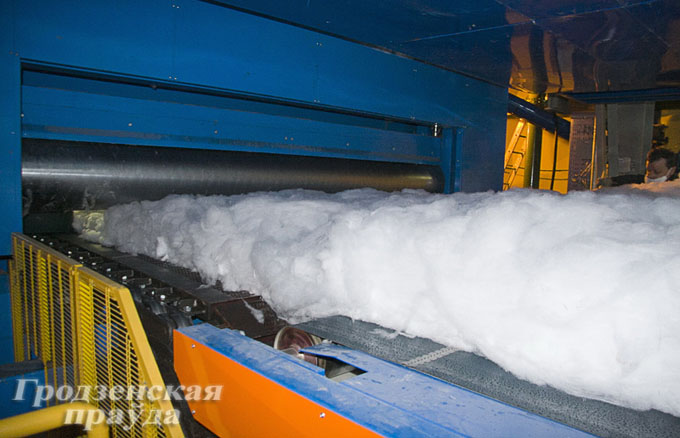 – Мы будем производить стекловату разной плотности – от 10 до 100 килограммов на метр кубический – и разных размеров, – рассказывает Юрий Кисляк, начальник цеха стекловаты. – Аналогов в Беларуси нет. Мощность нового производства – 16,3 тысячи тонн стекловаты в год.