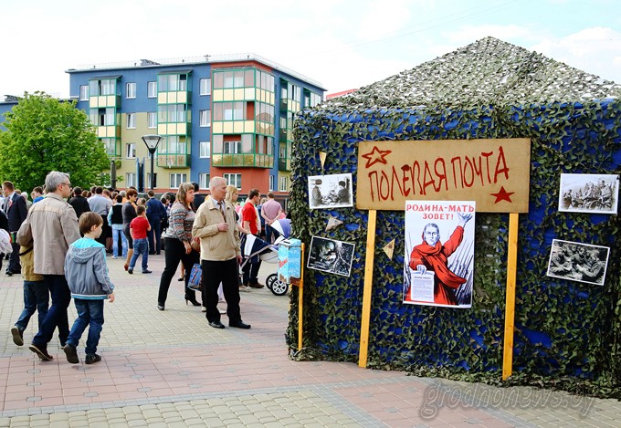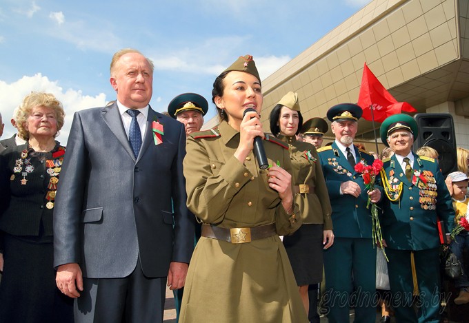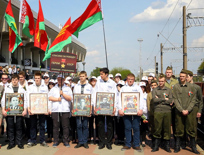 В областном центре гостей встречали заместитель председателя облисполкома Виктор Лискович, первый секретарь обкома ОО «БРСМ» Александр Ковш, ветераны Великой Отечественной войны, союзная молодежь, горожане. – Агитпоезд символизирует Великую Победу, которую в 1945 году принесли наши отцы, деды, прадеды. Эта яркая акция навсегда запомнится всем, кто сегодня пришел на перрон. Равно как память о войне и погибших на ней будет вечно жить в памяти народов-победителей, – отметил Виктор Лискович. Ветеран ВОВ Валентина Баранова поблагодарила молодое поколение за память о войне и уважение к ветеранам. Она спела «День Победы», песню тут же подхватили сотни пришедших на перрон горожан. Другие известные песни о войне исполнил оркестр воинской части 5522. Молодежь кружила под звуки вальса. Атмосферу военных лет воссоздали прямо на перроне. Студенты ГрГУ имени Янки Купалы обустроили солдатский привал с игрой на гармошке. На площадке «Перевязочная батальонного медпункта» студенты-медики демонстрировали, как оказывалась помощь раненым в бою. Гродненский филиал РУП «Белпочта» представил выставку открыток и предлагал отправить письмо-поздравление ветерану. Показательное выступление устроили бойцы-кинологи Гродненской пограничной группы, военнослужащие Западного оперативного командования. Работала полевая кухня. Затем пассажиры агитпоезда приняли участие в митинге у Мемориального комплекса воинам-пограничникам. К ним, а также к горожанам обратился ветеран Великой Отечественной войны, ветеран Пограничных войск, Почетный гражданин Гродно, Почетный пограничник Республики Беларусь Григорий Обелевский. Под звуки оркестра Гродненской пограничной группы участники митинга возложили живые цветы к подножию Мемориала. После этого участники акции устроили концерт в Доме ветеранов. Праздничная программа продолжилась в городском парке имени Жилибера при участии пассажиров агитпоезда и студентов ГрГУ имени Янки Купалы. Вечером агитпоезд отправится дальше. Следующая станция – Барановичи. Акция завершится 5 мая в столице. Фото Михаила ИСАЧЕНКОЖанна БАЙГОТ