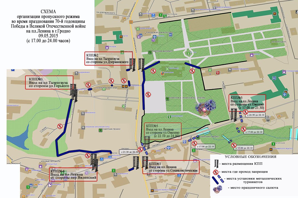С 21.30 часов до 22.10 часов движение по улице Ожешко от шахматно-шашечного клуба до перекрестка улиц Ожешко-Дзержинского будет закрыто. После салюта можно будет пройти через КПП на пересечении улиц Ожешко и Социалистической.