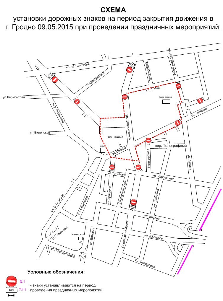 Движение транспорта будет закрыто с 7 до 12 часов по проспекту Космонавтов на участке от кольцевой развязки возле гипермаркета «Алми» до пересечения с улицей Карского (в районе ОАО «Гродно Азот»). А также с 16 до 24 часов по улице Дзержинского (от улицы Ожешко до пересечения с улицей 17-го Сентября), по улице Ожешко (от пересечения с улицей Ленина до улицы Советской) и на всей площади Тызенгауза.