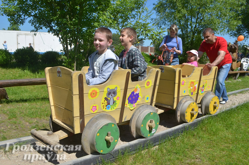Волковыск. В парке райцентра для ребят работали аттракционы, проводились конкурсы и викторины, а также дискотека. В свой первый рейс вышли 10 недавно приобретенных электромобилей. Бесплатно на них смогли покататься воспитанники детского дома и дети-инвалиды.