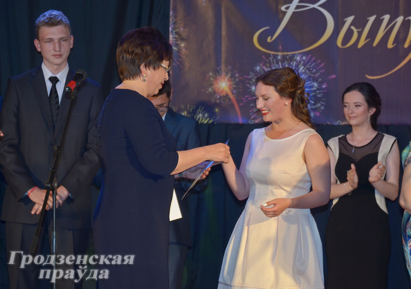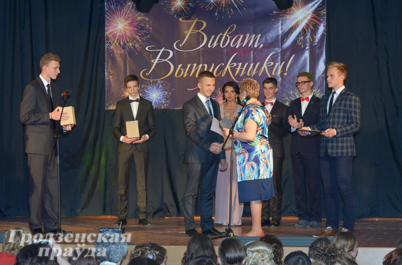 Первыми на сцену пригласили золотых и серебряных медалистов: Романа Лозовского, Никиту Волковича, Валерия Шевцова, Марию Дикевич, Эллу Френкель, Арину Кривонос, Надежду Драчиловскую, Полину Касьян и Людмилу Кулипу. Им аттестаты и символ знатоков вручали директор гимназии Анна Дулуб, а также почетные гости церемонии: заместитель председателя Постоянной комиссии по образованию, здравоохранению, социальной политике Совета Республики Национального собрания Республики Беларусь, главный врач областного клинического кардиологического центра Тамара Долгошей и председатель областного суда Александр Корзун. Поздравляя выпускников, Тамара Долгошей сказала, что они – настоящие везунчики: