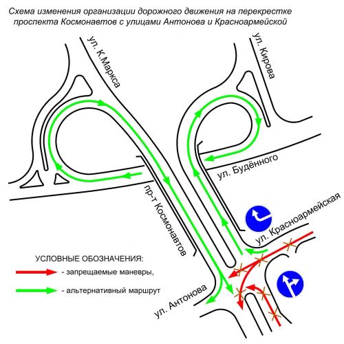 На перекрестке проспекта Космонавтов с улицами Антонова и Красноармейской неподалеку от автовокзала с понедельника надо ездить по новым «маршрутам». Разметка и дорожные знаки указывают: левый поворот с проспекта Космонавтов на Антонова уже невозможен. Так же с улицы Красноармейской отныне можно ехать лишь направо, а прямо и налево – нельзя.