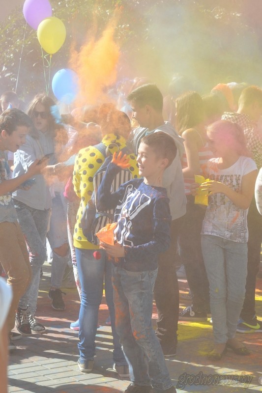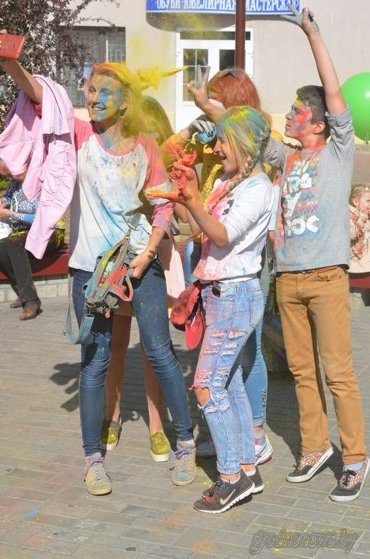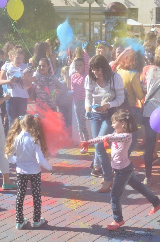 - Час волшебства, немного косметики, чуточку реквизита - и обычный воспитатель превращается в Бабу-Ягу и Водяного, - наперебой рассказывали педагоги ясли-сада №3. - Но мы сегодня никого в болото утаскивать не будем! Будем развлекать и радовать детвору. Старания не остались незамеченными. Дети отблагодарили восхищенными взглядами, радостными аплодисментами и искренними улыбками. *** Желтый, красный, синий, зеленый… Плитка, скамейки и даже деревья возле молодежного центра «Гродно» покрылись разноцветной пылью. А всему «виной» фестиваль красок «Holi Fest». Весело под музыку молодежь, мамы с детьми и даже серьезные мужчины, не жалея своей одежды, обсыпались ярким порошком. Особо ловкие умудрялись собрать на себе всю цветовую палитру. Когда закончилась краска, настало время фотографий. Не обошлось и без модных ныне селфи. Организаторам даже пришлось на время приостановить развлекательную программу, чтобы дать участникам фестиваля возможность запечатлеть это яркое зрелище со всех ракурсов. *** Вообще праздничные площадки, расположенные не в центре города, кажется, доказали свою состоятельность. В Ольшанке основными гостями праздника стали дети и молодые родители. Согласитесь, с малышом не всегда удобно выбираться в людные места, а тут праздник сам пришел к дому. Артисты получили благодарных и многочисленных зрителей, торговля, судя по очередям у павильонов, хорошую выручку. *** Микрорайон улицы Томина гулял у стен СШ №33. Конкурс рисунков, самодеятельный концерт, активная и насыщенная спортивная программа – скучно уж точно не было.
