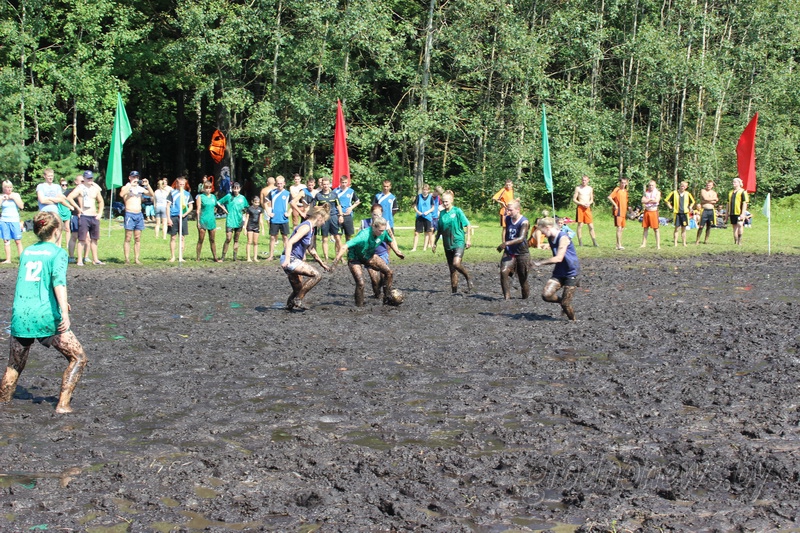 А посмотреть здесь было на что. С утра на импровизированном поле, заполненном грязью, начались спортивные состязания: здесь выясняли, чья команда играет лучше в болотный футбол дружины со всей Гродненщины. Надо сказать, в зрелищности с этим состязанием мало что может поспорить… Разве что заплывы на чем попало (но об этом позднее).