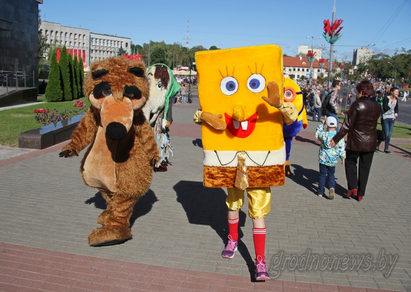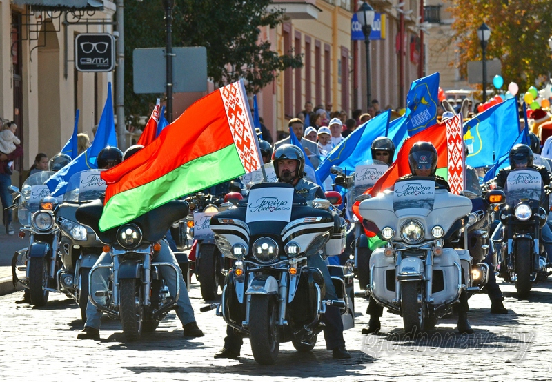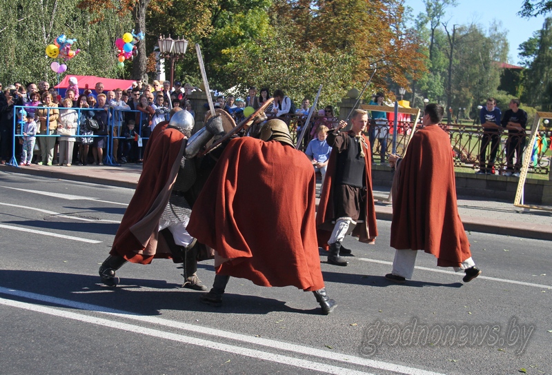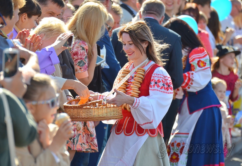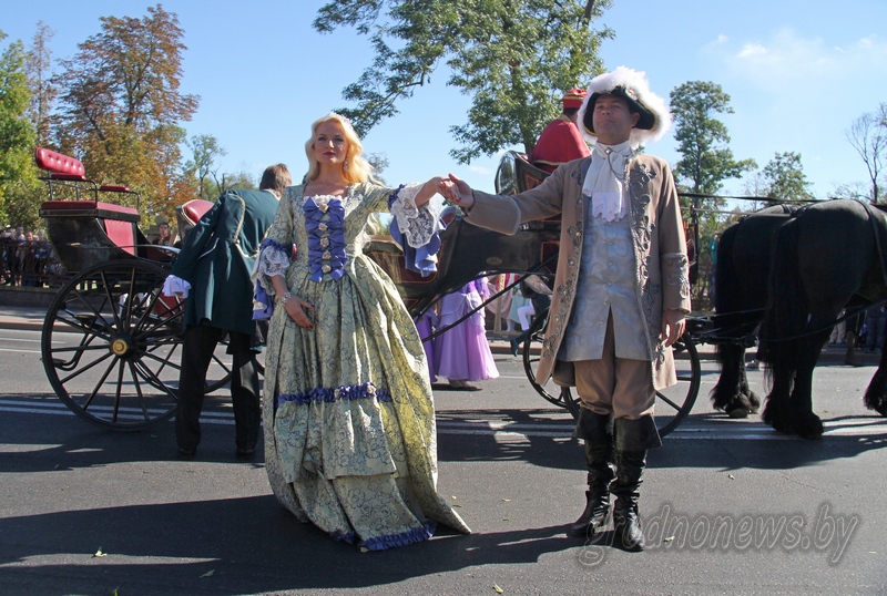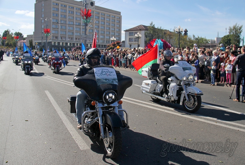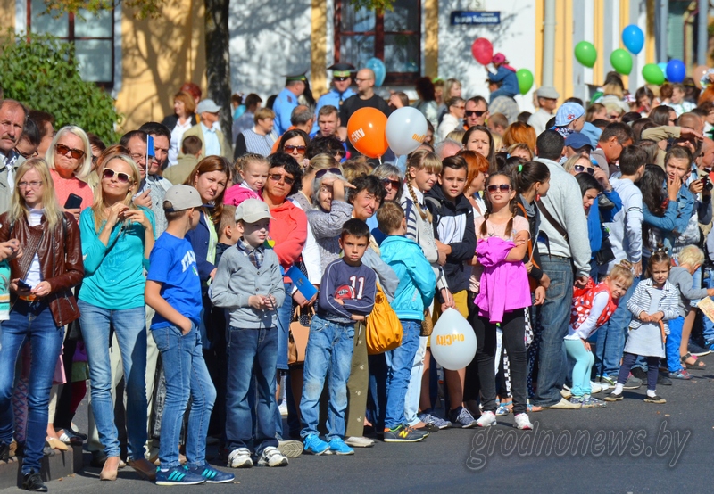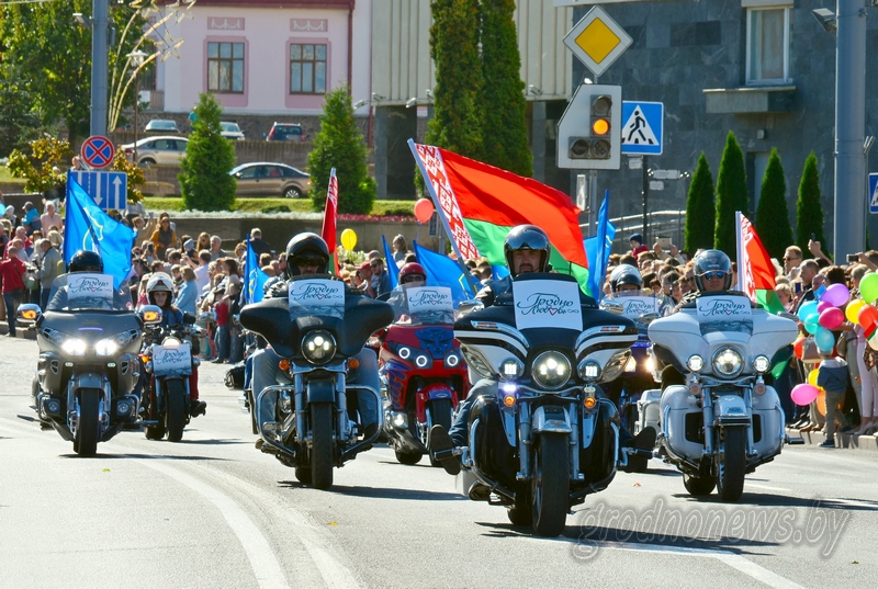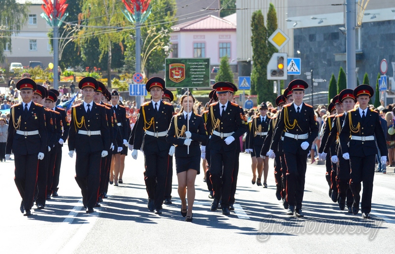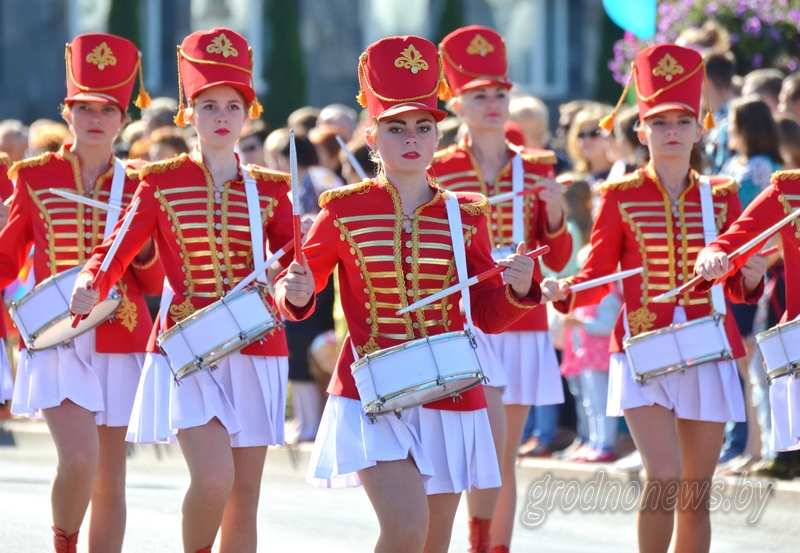 Горожане и многочисленные гости с нетерпением ждали праздничное шествие, создав живой коридор вдоль улиц Социалистической и Дзержинского. Представление началось прямо на проезжей части у парка Жилибера. И вот в сторону главной площадки праздника на площади Ленина двинулось шествие. Открыли колонну байкеры. Флаг города пронесли спортсмены, которые прославили Гродно на различных спортивных аренах. Среди них были Иван Тихон и Виталий Бубнович. Самые юные участники парада вместе с родителями приняли участие в дефиле колясок. В детской колонне прошествовали учащиеся школ, областного кадетского училища, СДЮШОР города. За ними – студенты вузов, представители общественного объединения БРСМ, интеллектуального движения «100 идей для Беларуси». Прошли участники творческих коллективов, работники театров, духовые оркестры. Внушительной была колонна трудовых коллективов города.