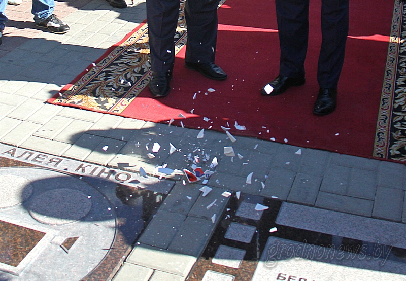 Почетные гости по традиции в честь открытия аллеи кино разбили тарелку о памятные плиты.
