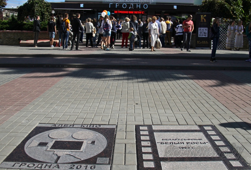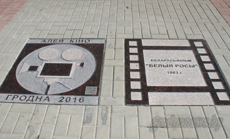 Кинематографическая карьера города началась в 1956 году со съемок фильма «Миколка-паровоз». С тех пор в городе над Неманом было снято более полусотни художественных картин, среди которых легендарный кинофильм «Белые Росы» с Николаем Караченцевым и Всеволодом Санаевым. Именно эта кинокартина и увековечена на первой плите, на которой выбита надпись «Беларусьфильм». «Белые Росы». 1983 год». Еще одна плита «Аллея кино. Гродно. 2016 год» – свидетельство знаменательного события в жизни города.