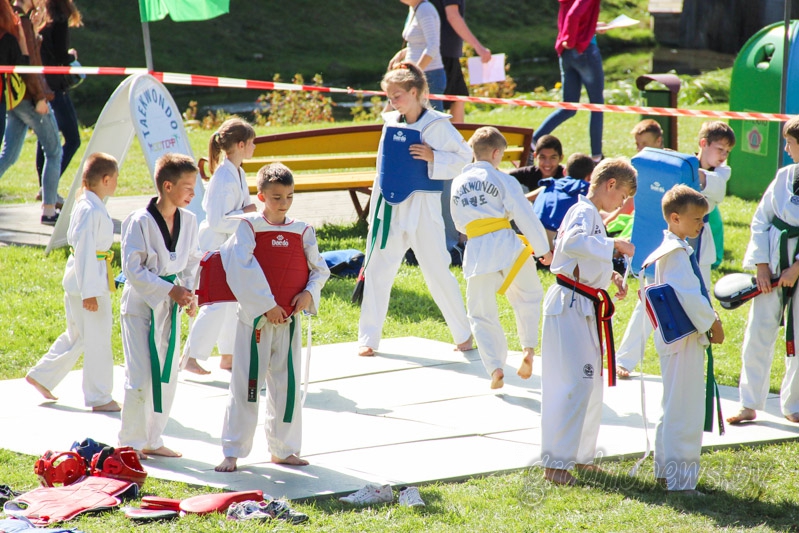 В Швейцарской долине можно было опробовать свою ловкость в конкурсах, походить на ходулях, сыграть в теннис и шашки, скатиться на тросе с высокого дерева. Тут же демонстрировали свои таланты дети из Гродненскихсекций по таэквондо и художественной гимнастике.