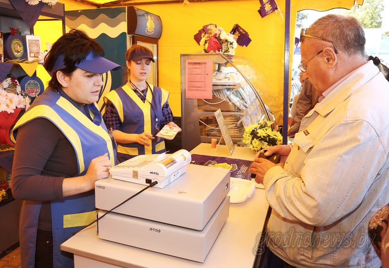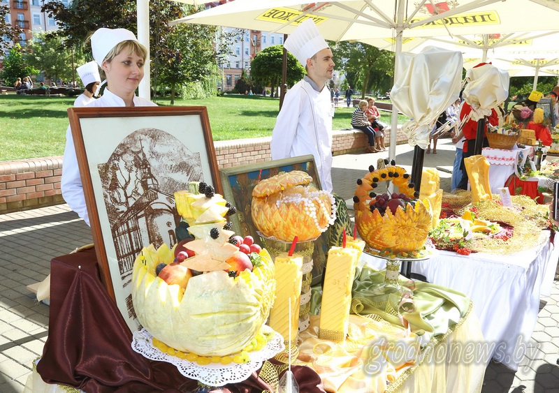 Особенно многолюдно было возле выставки скульптур из сыра, посвященной 888-летию Гродно. Различные торговые предприятия и объекты общественного питания сотворили нечто немыслимое: миниатюру Коложской церкви, герб города, замысловатые панно...