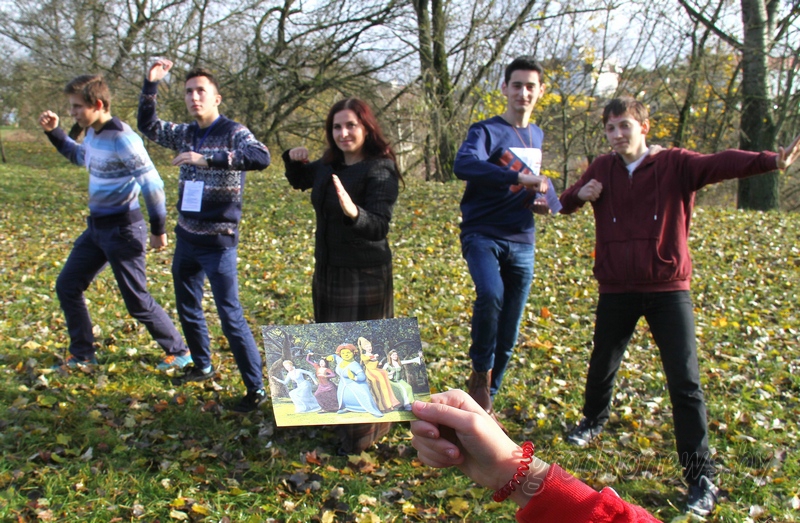 Уже первое задание для команд заставило ребят проявить максимум креатива: им раздали фотографии, на которых есть люди, животные и невиданные звери, часто это кадры из фильмов и мультфильмов. Задача участников – сделать максимально похожий снимок. На ходу крутили уши из шарфов, рисовали носики косметическим карандашом, ловили отражение в луже и привлекали в кадр работников гардероба.
