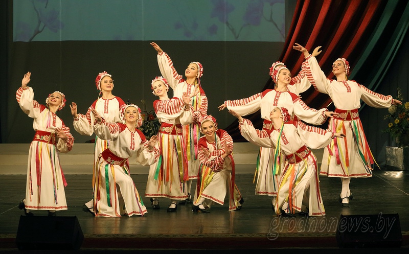 В праздничную атмосферу зрителей окунули уже в фойе музыканты духового оркестра «Гарадзенскія трубы», а саму концертную программу открыла хореографическая композиция «Время вперед» в исполнении заслуженного любительского коллектива Республики Беларусь ансамбля танца «Гарадзенскія карункі».
