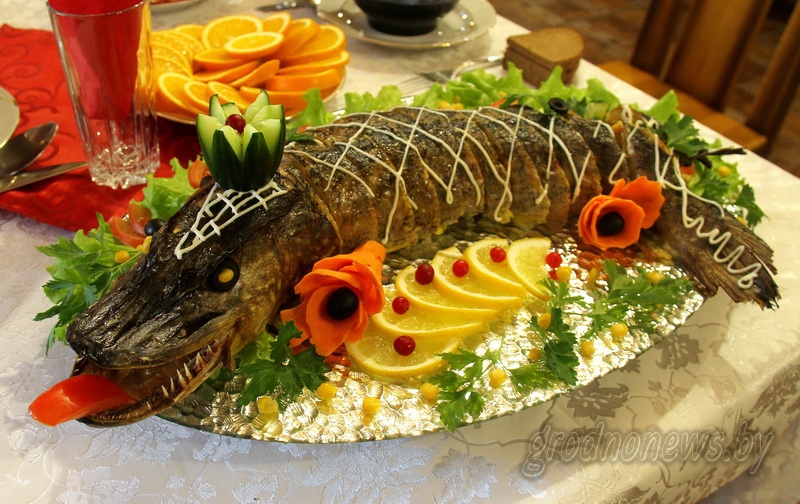 Блюдо лучше подавать холодным. Выложить на плоское блюдо, украсить зелеными листьями салата, помидорами, оливками, лимоном, розочками из моркови. Голову рыбы можно украсить короной из огурца.