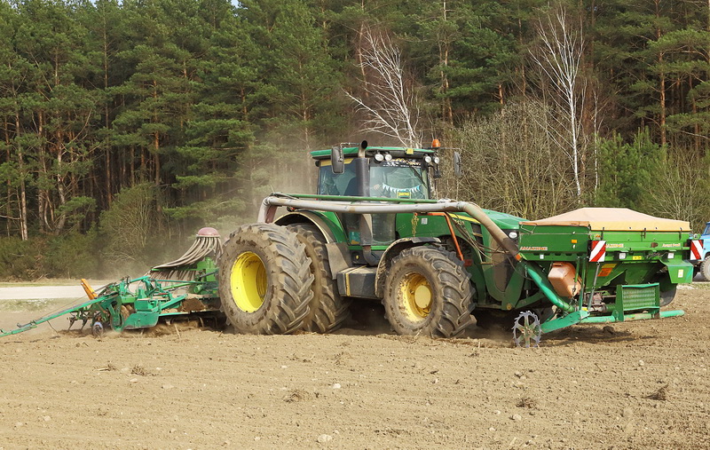 Калі мы завіталі на поле ля бульбасховішча саўгаса “Вялікае Мажэйкава”, па ім размерана рухаўся энерганасычаны трактар “Беларус-3522” у счэпцы з сеялкай “Амазонія”, пакідаючы пасля сябе шасціметровыя палосы засеянай зернем зямлі. Услед за тэхнікай увязалася невялікае воблака пылу – доказ таго, што глеба дастаткова прасохла і прагрэлася.