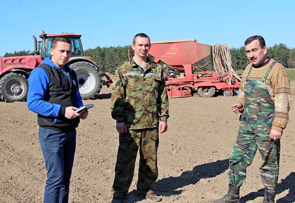 Четвертый сезон занят на посевной в КСУП «Пограничный-Агро» Василий Царанков (в центре снимка). А через два дня будет три года, как он устроился на работу в это хозяйство. Заметили старательного и трудолюбивого парня и через год доверили энергонасыщенный трактор. В этом году на его счету уже около 400 гектаров засеянных площадей. Довольны его отношением к порученному делу главный агроном хозяйства Виктор Белобокий (слева) и начальник производственного участка «Грицевичи» Виктор Циунчик (справа).