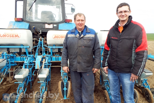 Сеяць яравы ячмень Юрыю Мар’янавічу дапамагае механізатар Дзмітрый Ільіч Панасік. За якасцю пасяўных работ сочыць намеснік загадчыка вытворчага ўчастка “Мажэйкава” А.П. Багданаў.