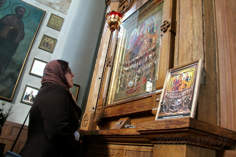 Это – копия образа Божией Матери «Всецарица», написанная специально для церкви Святого Михаила Архангела в Сынковичах на Святой горе Афон в Греции с оригинала, хранящегося там. Прямо на иконе – множество драгоценных даров от тех, кто получил исцеление.