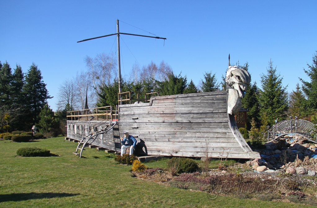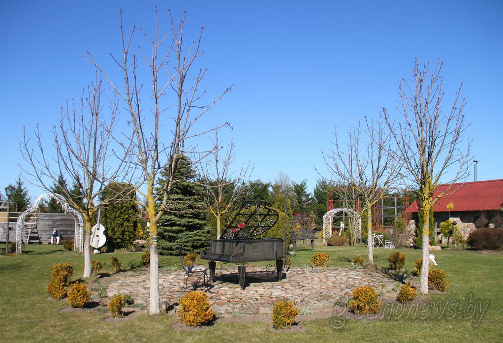 На лужайке – витиеватый кованый рояль в натуральную величину, виолончель, уютные беседки, летняя эстрада и огромный деревянный корабль. Туевые аллеи ведут к пятиярусному дому на берегу пруда, там же – летний дом с террасой, выходящей на воду. Чуть дальше еще один дом, как выяснилось, гостевой, с залом для торжеств со 120-летним трофейным роялем, чайной комнатой, корчмой.