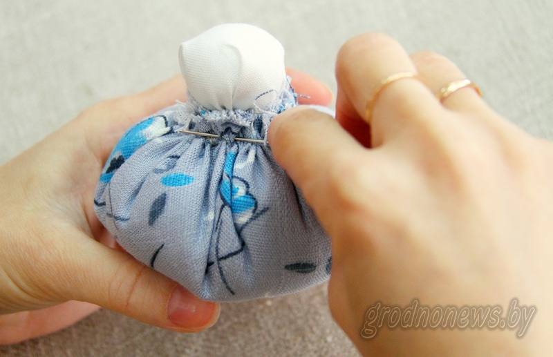 Такой осовремененный подход выбираем и мы. Поэтому на столе появляются ножницы и иголка. В центр небольшого кусочка ткани кладем плотный шарик синтепона или другого наполнителя, завязываем – это будущая головка. Шьем юбочку: стежками прошиваем край круглого кусочка цветной ткани, потом собираем в мешочек, который наполняем синтепоном. Вставляем головку куклы, добавляем наполнитель, чтобы было плотно, и зашиваем. Длинную полоску белой ткани завязываем аккуратным узелком посередине, прикладываем к туловищу и прикрепляем ниткой – получаются ручки. Завязываем фартушек, потом платочек. Полчаса – и текстильная куколка готова. А самое приятное, что она всегда получается. И всегда красивой.
