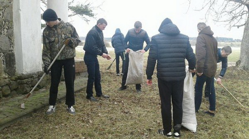 Ошмянский район, государственное учреждение образования "Гольшанская средняя школа". Участие в республиканском субботнике. Наведение порядка и благоустройство территории, прилегающей к Гольшанскому замку. Уборка территории школы.