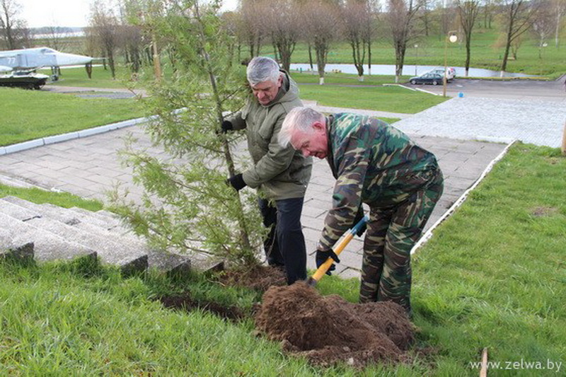 Трудовой десант развернулся в центральном парке. Представители районной власти высаживали деревья вдоль ступенек, ведущих к мемориалу погибшим воинам и партизанам в годы Великой Отечественной войны.