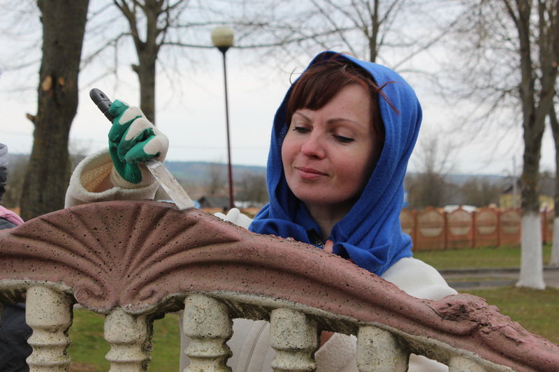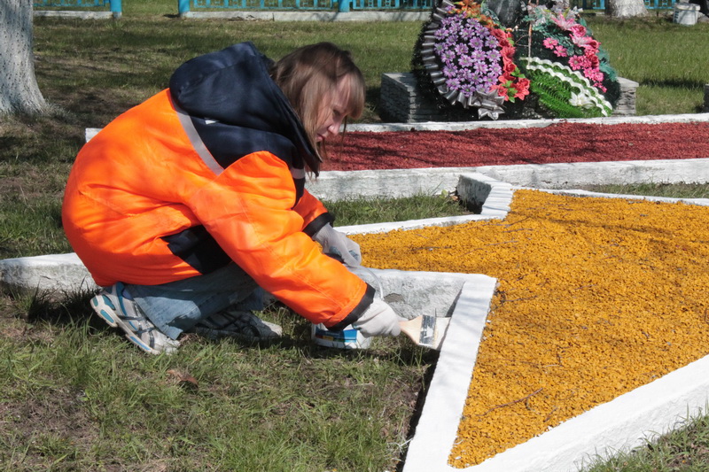 После обеда к труду приступила дружная трудовая бригада. Женщины взялись за кисточки: ограждения и бордюры требовали обновления. Мужчинам предстояло очистить траву от сухих листьев, убрать мусор, привести в порядок близлежащую территорию.